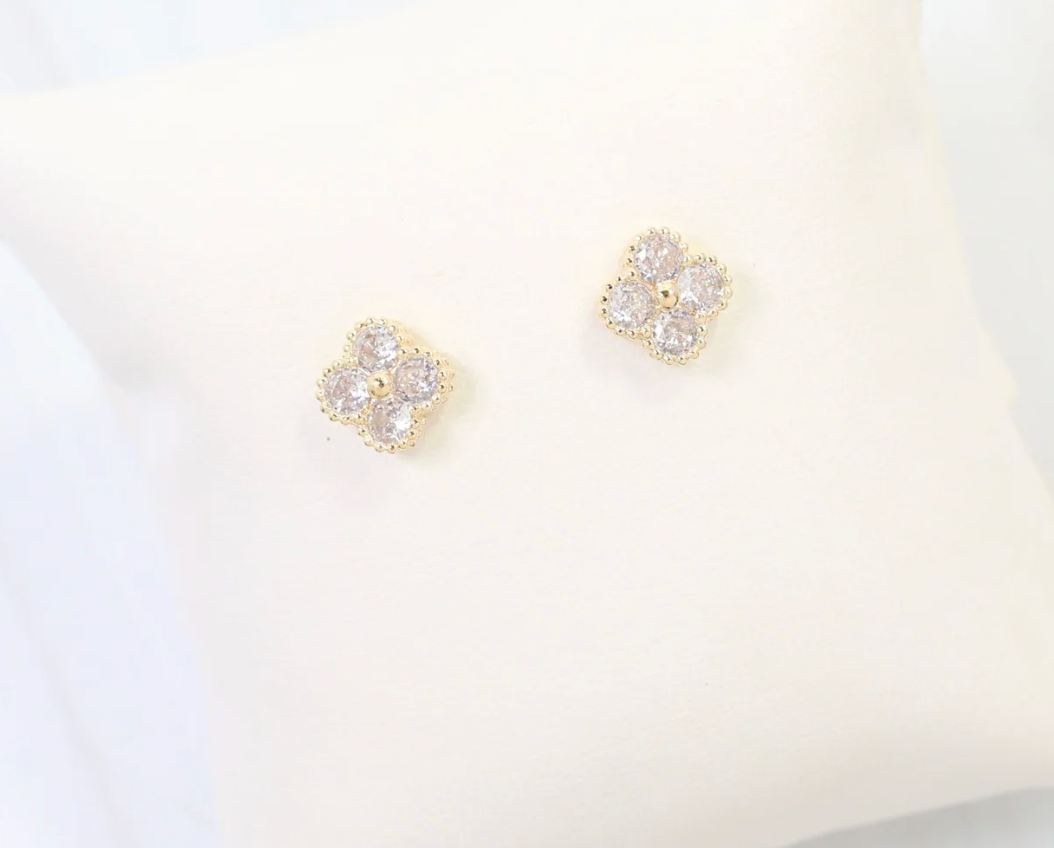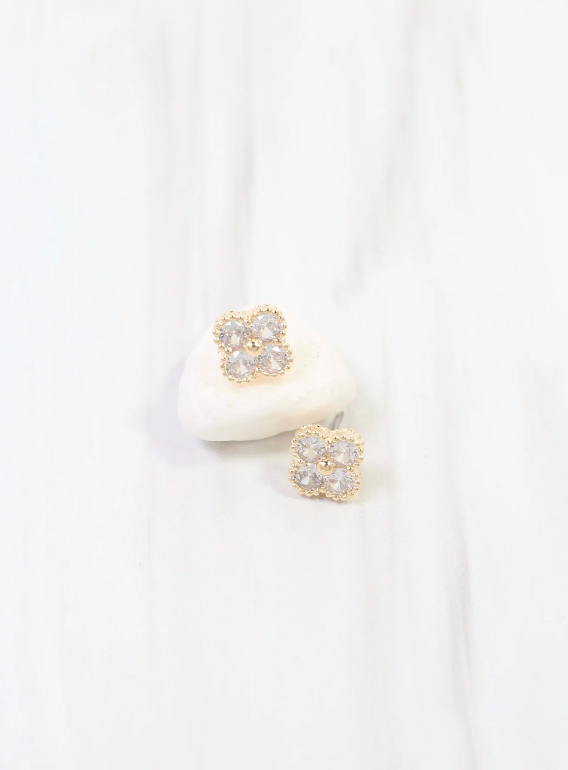 Lucky you! The Clovis CZ Clover Stud Earrings in gold bring a playful touch of charm to your everyday style. These delightful studs feature a four-leaf clover design sparkling with brilliant cubic zirconia. Perfect for adding a hint of whimsy and glamour to any look, these versatile earrings are sure to become your go-to pair.