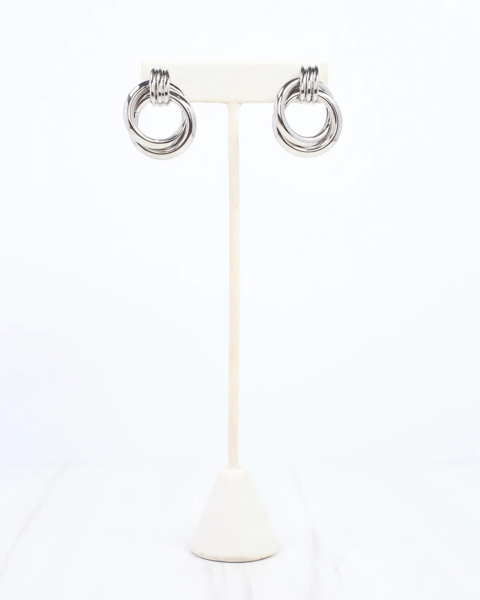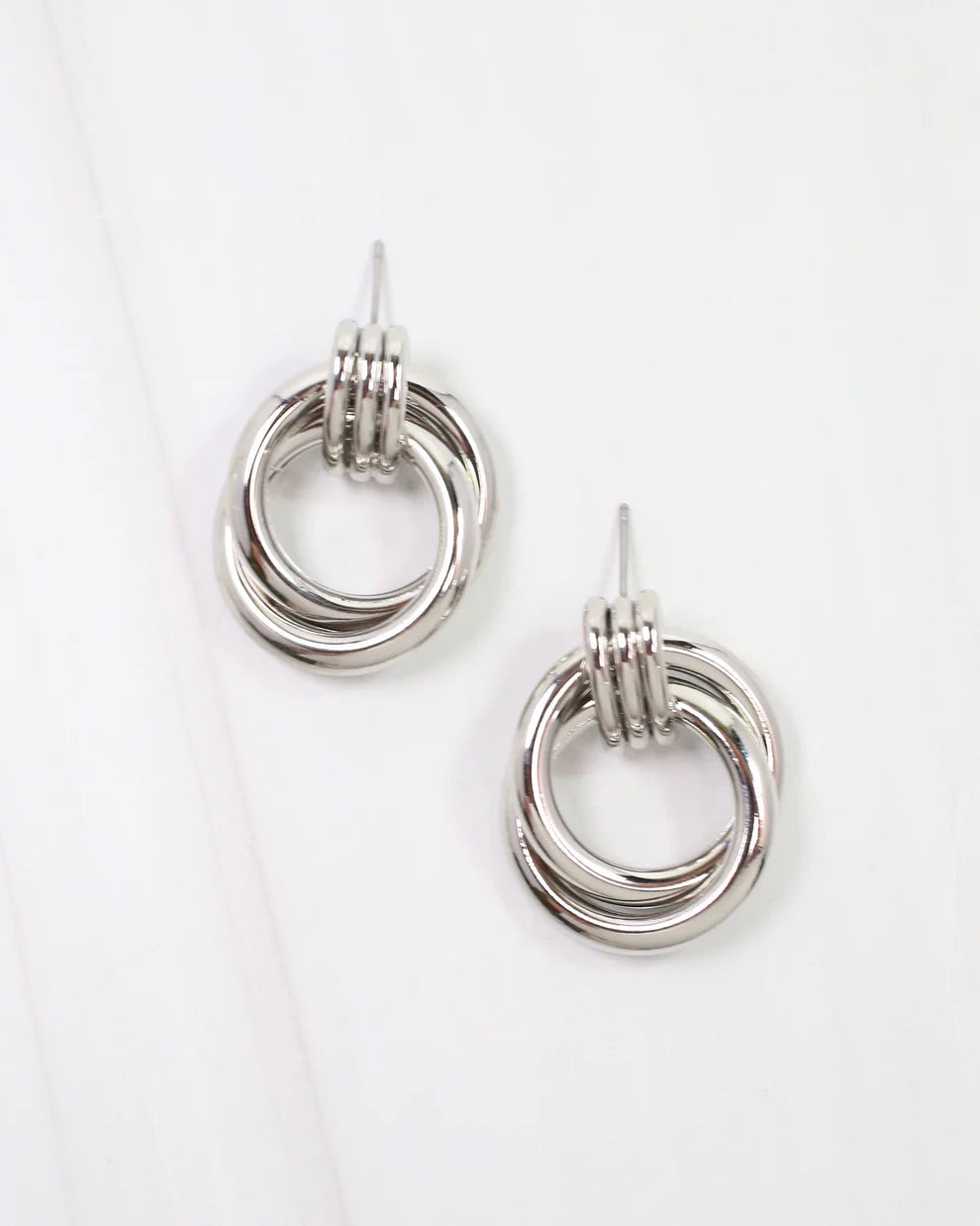 The Tucson Drop Earring in silver features a door knocker style with a triple-line stud and a double circle drop. Its classic and chic design adds a fashionable touch to any ensemble, making it a versatile accessory for both casual and dressy occasions.
