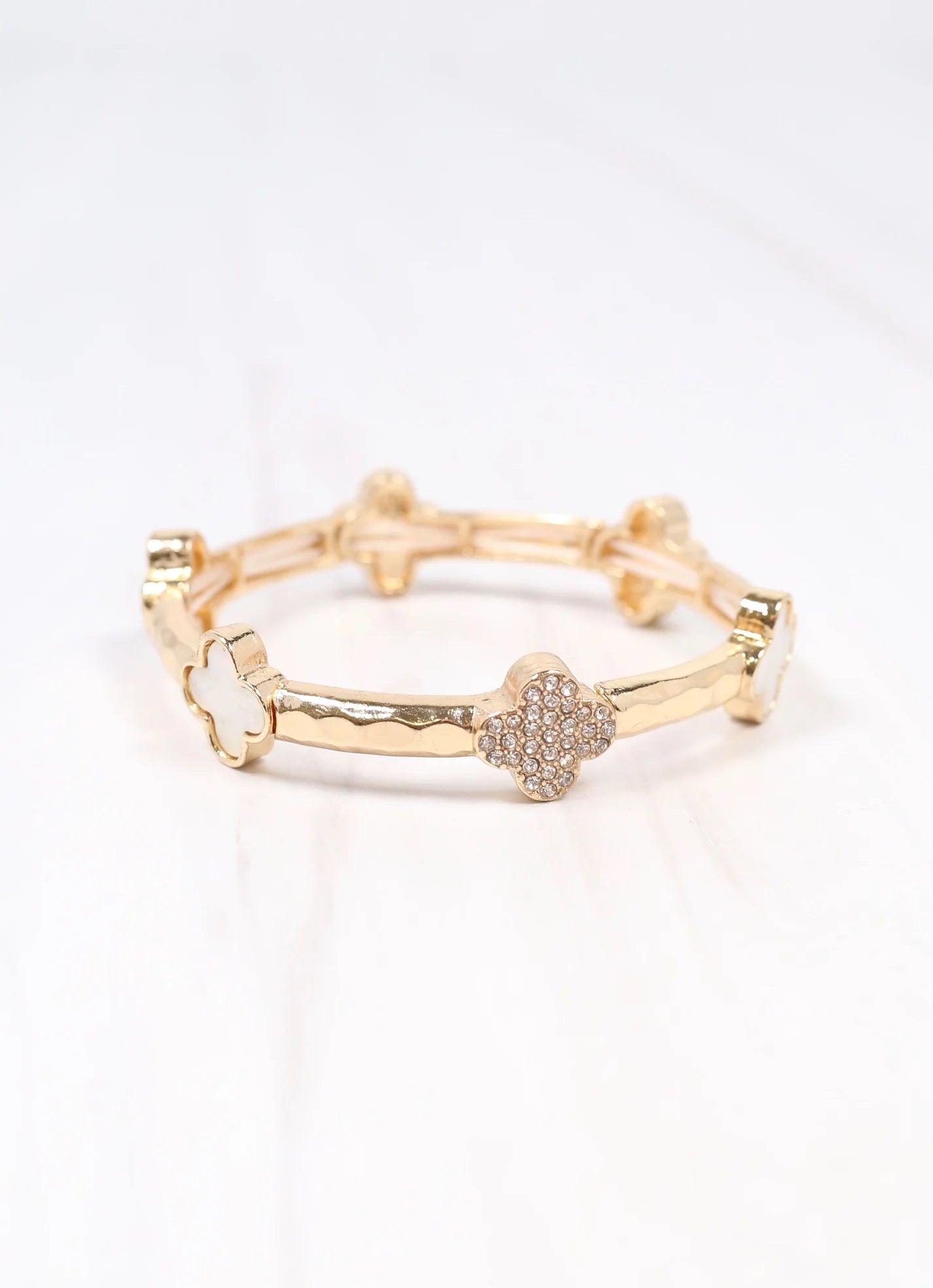 This amazing stretch bracelet has a hammered gold finish and is accented with white shell clovers and CZ filled clovers as well.