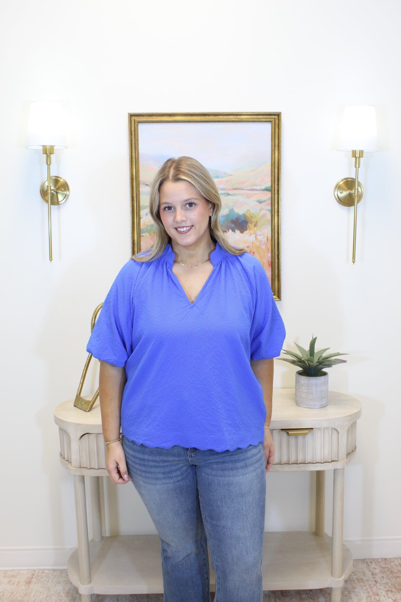 • Sleeve lining only poly seersucker bubble sleeve v slit neck scalloped edge top