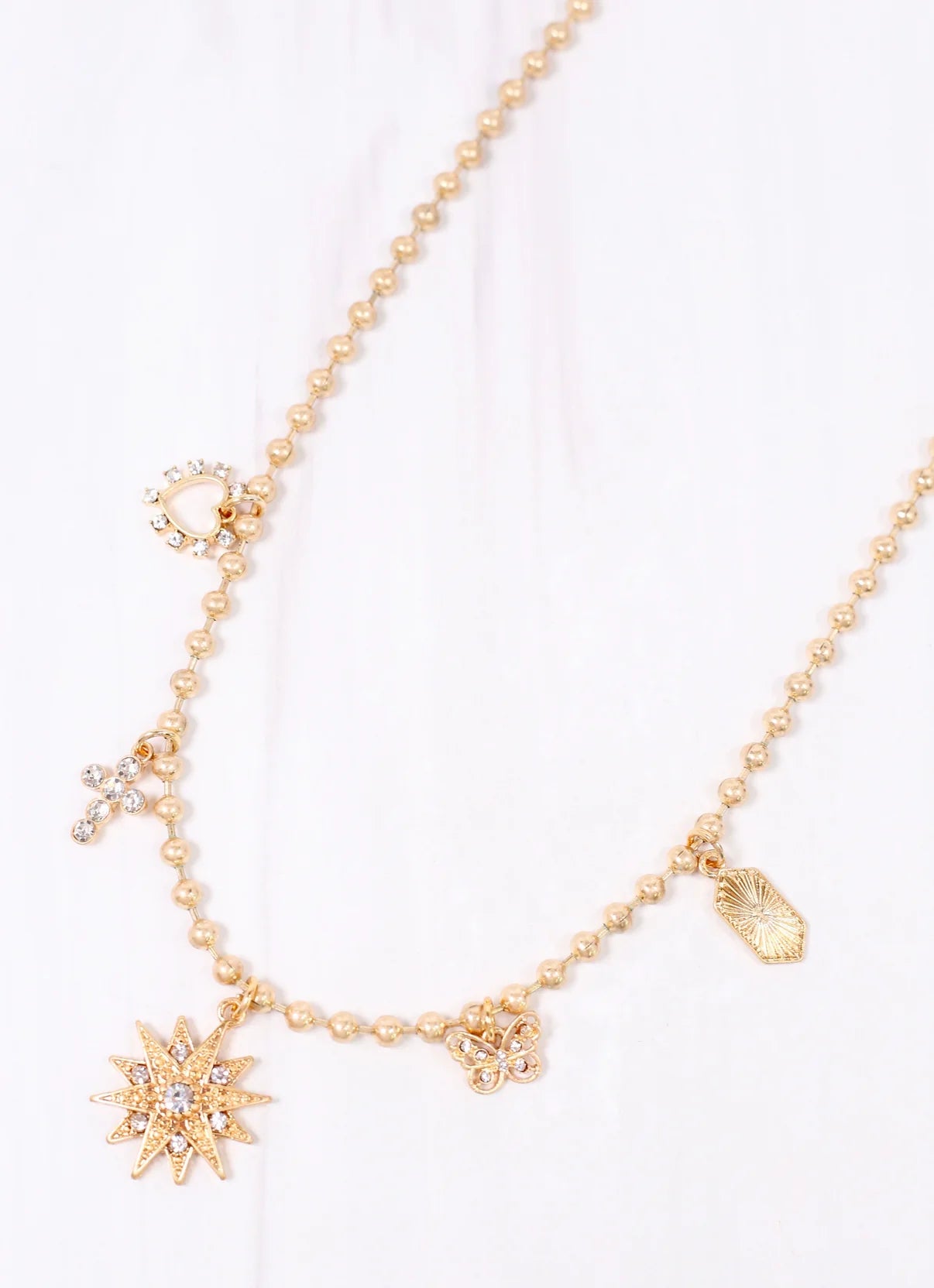 Be on trend with this lovely worn gold charm necklace. It is designed with a dotted chain and five pretty charms, each with their own look and CZ accents.