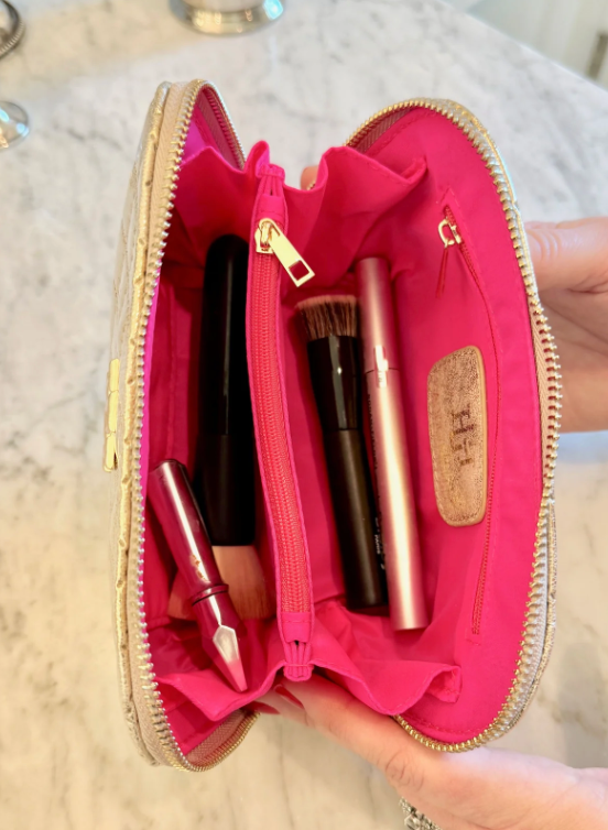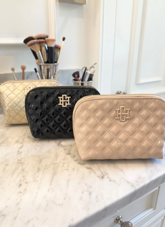 This gorgeous vegan patent leather pouch is part of our makeup and travel collection. It has a sleek and compact body style with a quilted fabric design. The elongated zipper provides easy access, making it perfect for organizing makeup, toiletries, and hair accessories. The spacious interior is lined with vibrant hot pink, wipeable nylon. It's the perfect size pouch to keep in your everyday tote for chargers, cosmetics, and so much more.