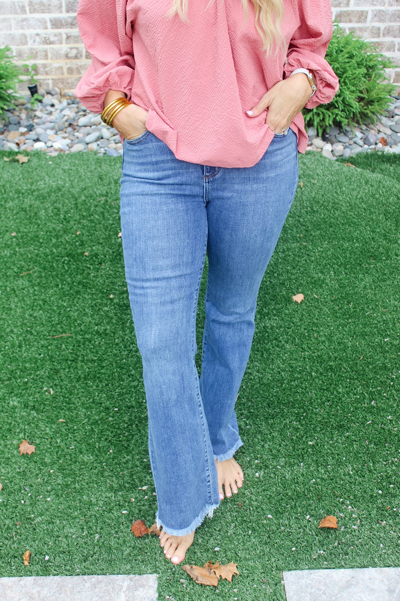 • High waisted bootcut double button waistband & frayed hem.