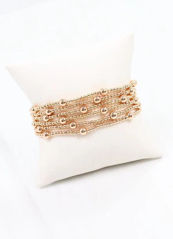 This basic bracelet set is a great go to for any occasion. It includes identical strands lined with two different sized beading. Pair them with other bracelet styles for a fully stacked look. Stretches to fit most wrists.