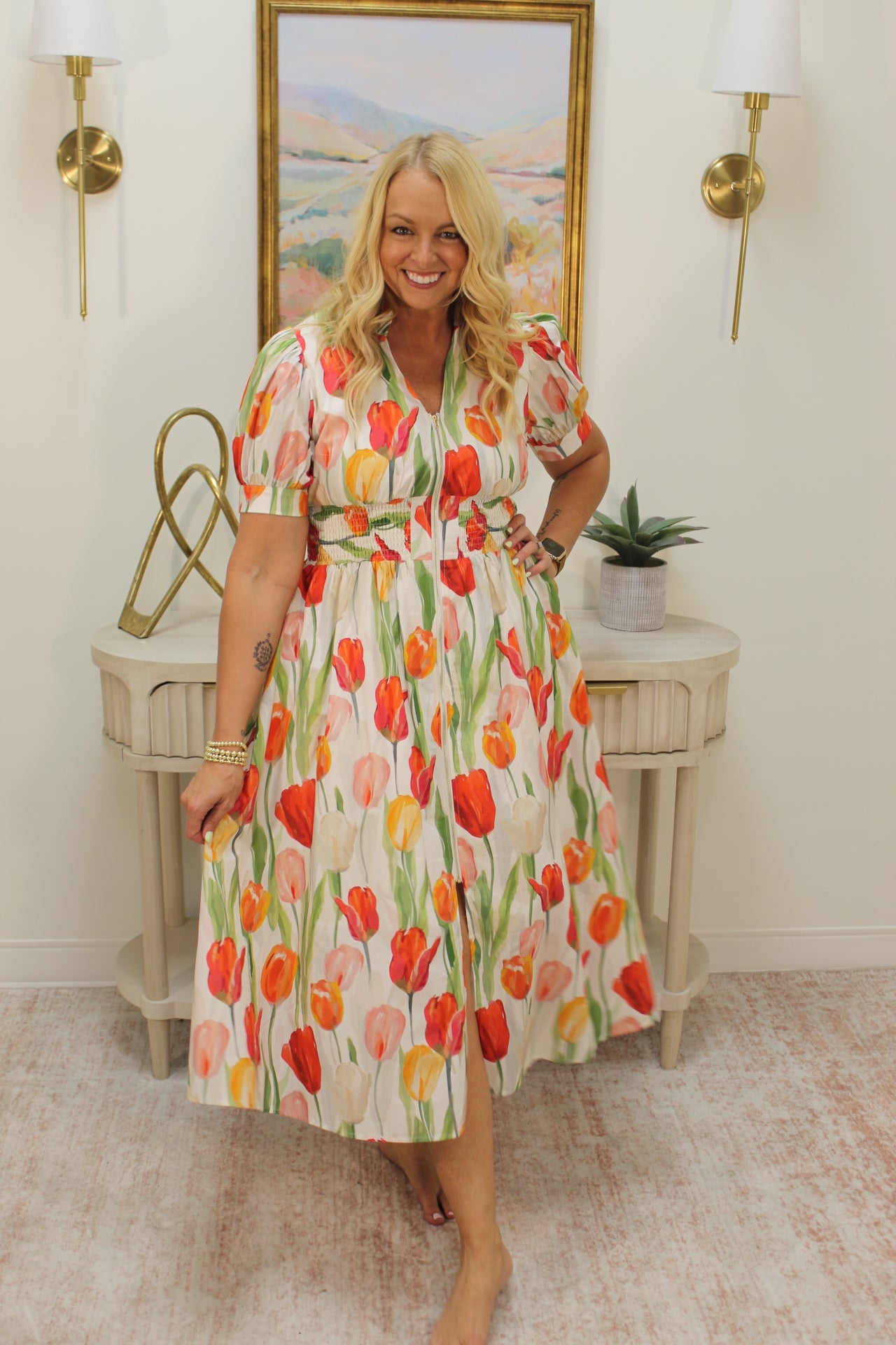 - Floral print short sleeve midi dress featuring smocked waist detail and front zipper closure. Side pockets.