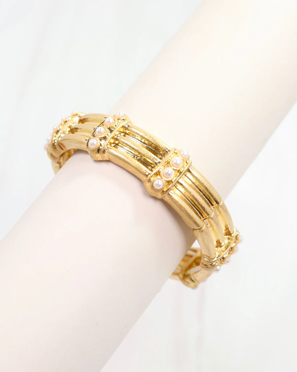 Indulge in the timeless sophistication of our Venetian Worn Gold and Pearl Stretch Bracelet. Inspired by classic old world charm, this bracelet features rows of worn gold embellished with delicate columns of four lustrous pearls. With its stretch style, it effortlessly fits most wrists, making it the perfect choice for any occasion. Elevate your style with this luxurious and exclusive piece.